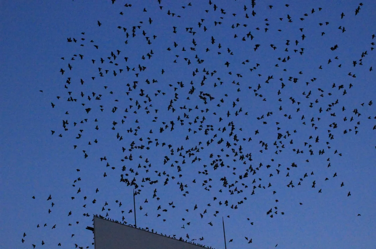 ムクドリの最も深刻な被害は、夕方から夜にかけて形成される集団ねぐらによるものです。数百羽から数千羽のムクドリが一箇所に集まることで、その周辺地域では騒音、糞害、悪臭など複合的な問題が発生します。集団ねぐらは一度形成されると、同じ場所を継続して使用する傾向があるため、被害も長期間継続することになります。